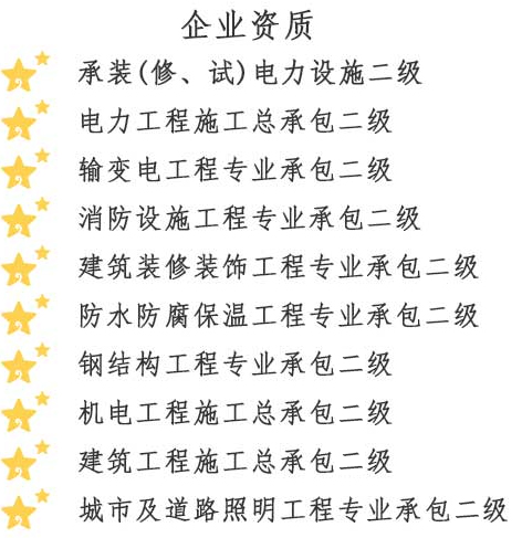 金楓電力集團(tuán)有限公司,成立于2015年5月28日,注冊(cè)資金6060萬元,是一家專業(yè)從事電力工程施工的集團(tuán)化公司。公司經(jīng)營(yíng)范圍包括:電氣安裝服務(wù);建設(shè)工程施工;輸電、供電、受電電力設(shè)施的安裝、維修和試驗(yàn);測(cè)繪服務(wù);建筑勞務(wù)分包;建筑工程設(shè)計(jì);發(fā)電機(jī)及發(fā)電機(jī)組制造;建筑工程機(jī)械與設(shè)備租賃;工業(yè)工程設(shè)計(jì)服務(wù);技術(shù)服務(wù)、技術(shù)開發(fā)、技術(shù)咨詢、技術(shù)交流、技術(shù)轉(zhuǎn)讓、技術(shù)推廣等。公司持有國家能源局頒發(fā)的承裝(修、試)電力設(shè)施許可證,承裝類二級(jí)、承修類二級(jí)、承試類二級(jí)資質(zhì);電力工程施工總承包二級(jí)資質(zhì);輸變電工程專業(yè)承包二級(jí)資質(zhì);建筑裝修裝飾工程專業(yè)承包二級(jí)資質(zhì);消防設(shè)施工程專業(yè)承包二級(jí)資質(zhì);防水防腐保溫工程專業(yè)承包二級(jí)資質(zhì);施工勞務(wù)資質(zhì);機(jī)電工程施工總承包二級(jí);建筑工程施工總承包二級(jí);城市及道路照明工程專業(yè)承包二級(jí);鋼結(jié)構(gòu)工程專業(yè)承包二級(jí)資質(zhì);公司已通過質(zhì)量管理體系認(rèn)證、環(huán)境管理體系認(rèn)證及職業(yè)健康安全管理體系認(rèn)證。并獲得省級(jí)信用評(píng)價(jià)AAA證書;連續(xù)多年納稅信用評(píng)價(jià)A級(jí)。